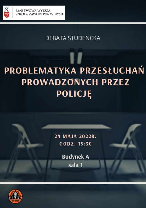 24 maja 2022 roku o godzinie 15:30 w sali nr 101  budynku A naszej Uczelni odbędzie się debata studencka nt. „Problematyka przesłuchań prowadzonych przez Policję”. Debata jest organizowana przez koło naukowe BWN, działające na Wydziale Nauk Społecznych. To wydarzenie zostało przygotowane w ramach grupy naukowej koła.