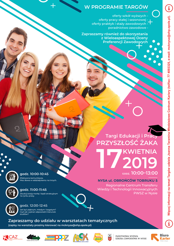 Już 17 kwietnia 2019r. w Regionalnym Centrum Transferu Wiedzy i Technologii Innowacyjnych PWSZ w Nysie obędzie się kolejna edycja Targów Edukacji i Pracy „Przyszłość Żaka”.