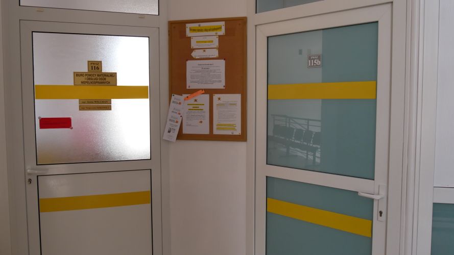 • w Uczelni funkcjonuje wypożyczalnia sprzętu specjalistycznego ułatwiającego dostęp do informacji i zajęć osobom z niepełnosprawnościami (w Biurze Pomocy Materialnej i Obsługi Osób Niepełnosprawnych)